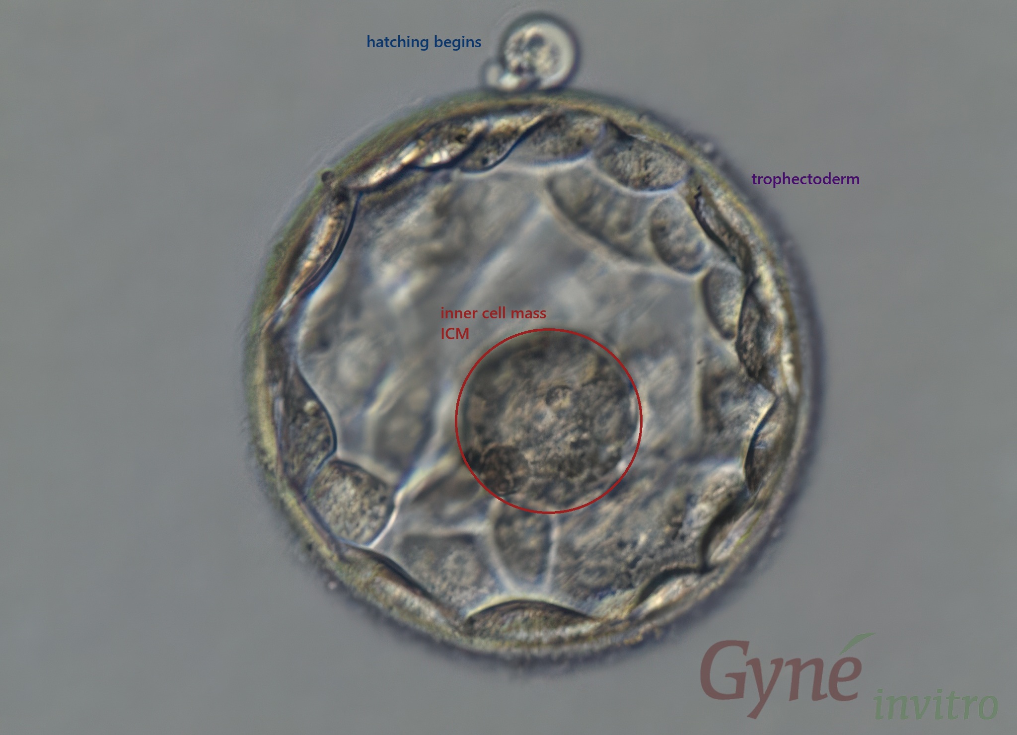 Am fünften Tag hat sich im Inneren des Embryos ein Hohlraum gebildet. Diese winzige Hohlkugel bezeichnen wir als Blastocyste. Es hat eine erste Spezialisierung der Zellen stattgefunden - die dunklere Zellansammlung links (sog. inner cell mass) bildet später den Embryo, alle übrigen Zellen der Aussenfläche des Kügelchens (das sog. Trophectoderm) die Placenta.