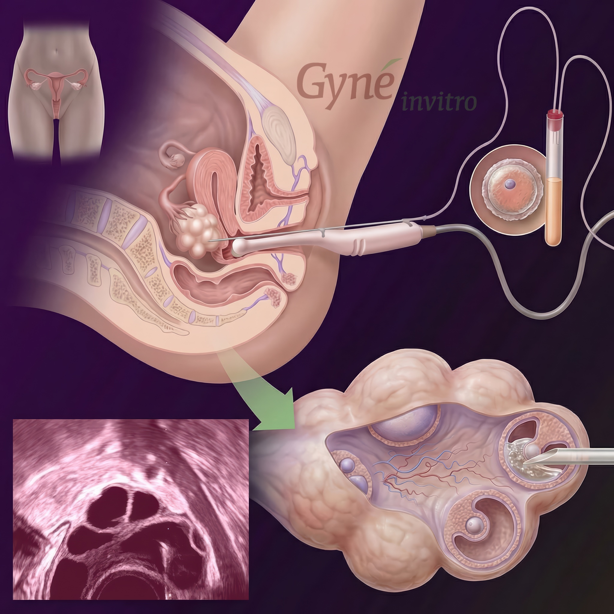 Darstellung der Ultraschall-gesteuerten Eizellentnahme durch die Scheide in Kurznarkose.
