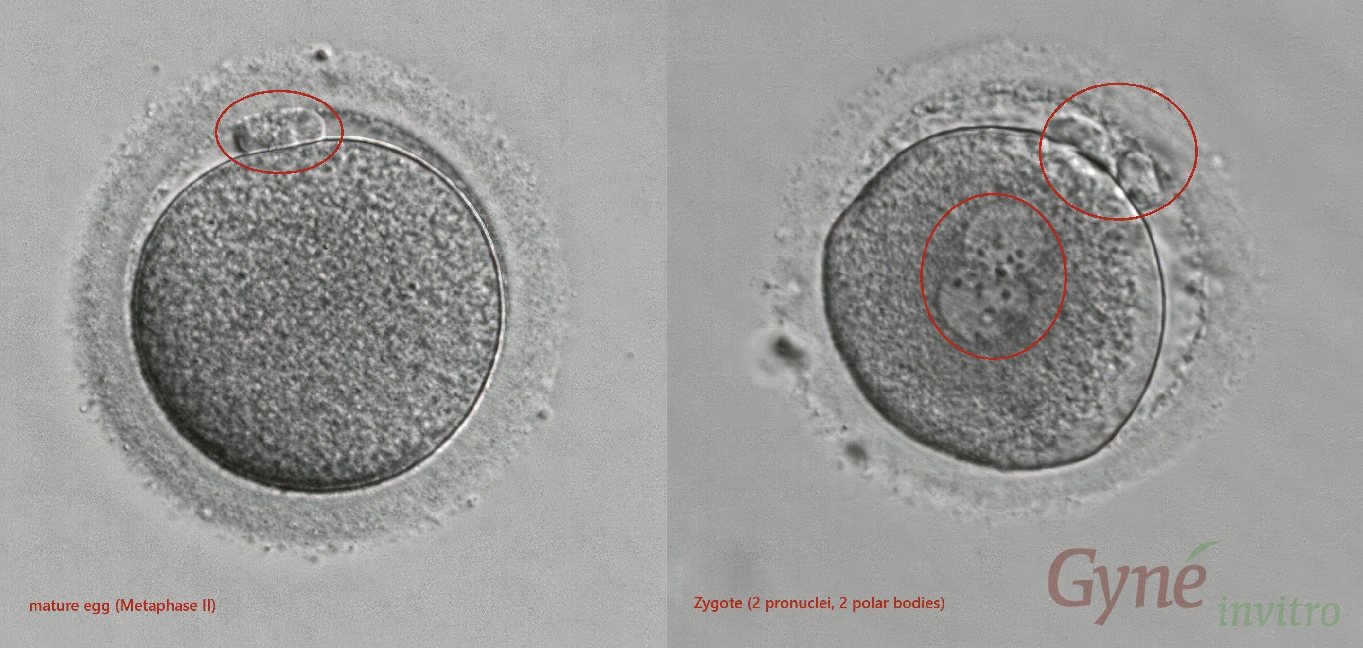 Oben links die reife Eizelle nach dem Absaugen aus dem Eierstock der Frau (rot eingekreist das sog. Polkörperchen). Nach erfolgter Befruchtung, am nächsten Morgen, sieht das Biologenteam rechts eine befruchtete Eizelle (Zygote) mit den beiden Vorkernen im Zentrum und den beiden aus der Zelle ausgestossenen Polkörperchen oben rechts (ebenfalls eingekreist). Die Vorkerne (Pronuclei) enthalten das weibliche und männliche Erbgut und werden in den nächsten Stunden verschmelzen (Syngamie).